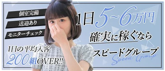 | 給与 | 未経験でも初日から5万円以上、月収130万円も可能!60分1.5万円〜の高バックに加え、5時間以上の体験入店で5万円保証あり。24時間受付&即日体入OK!スキマ時間で賢く稼ぐなら大手スピードグループへ。 |